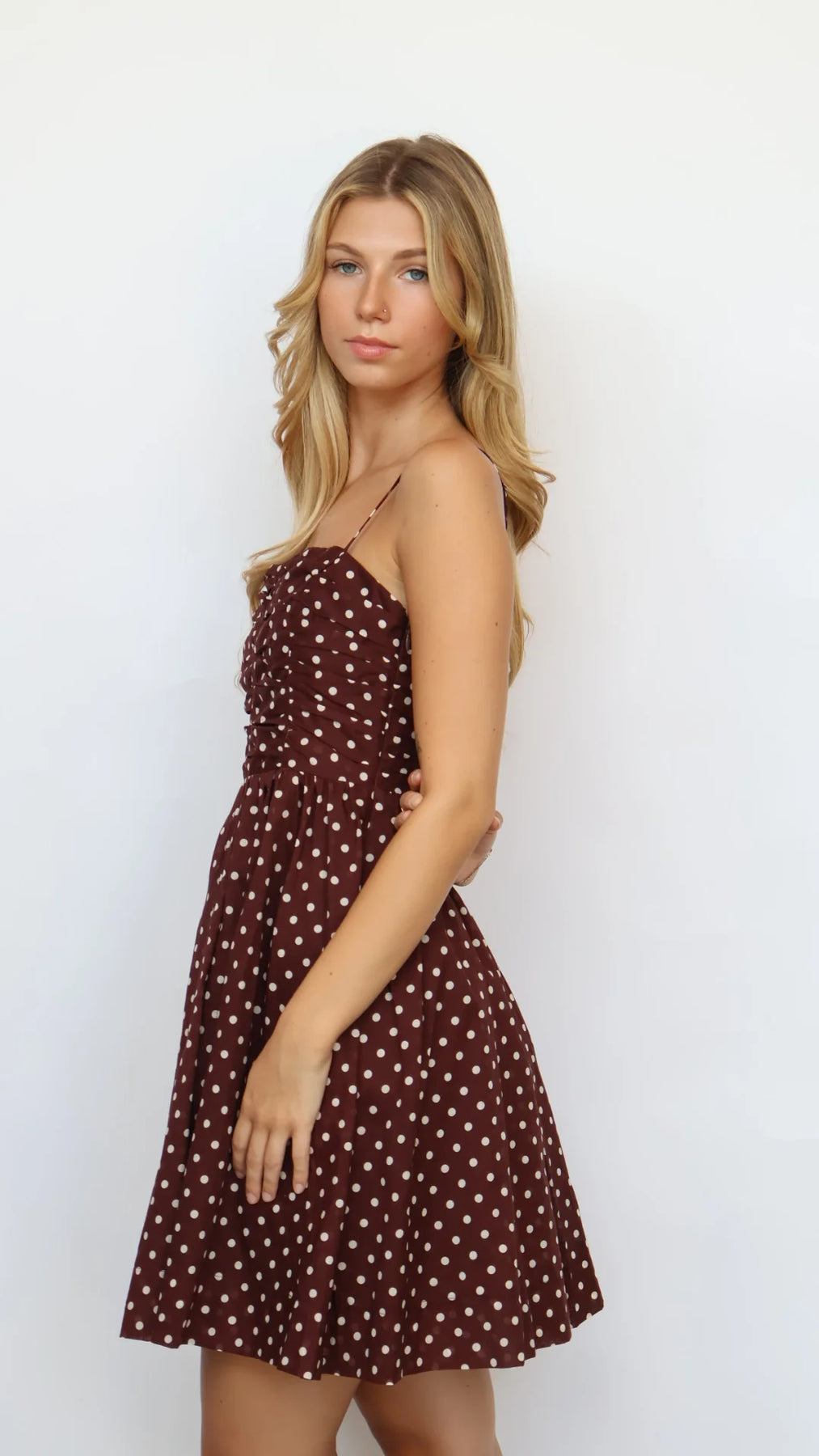 The Pinch Fit and Flare Polka Dot Mini Dress combines vintage charm with contemporary ease. Crafted from 100% cotton with a polyester lining, this piece features delicate spaghetti straps and a ruched bodice that creates a flattering silhouette before transitioning into a graceful fit-and-flare skirt. The timeless polka dot print brings playful sophistication, while the mini length ensures a modern, versatile look. Perfect for seasonal celebrations and everyday elegance. Length 33" (size Small), bust 35".