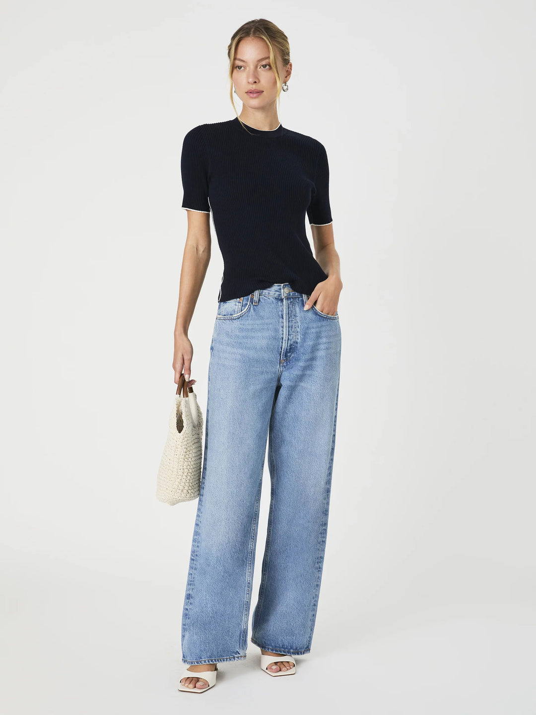 BRIELLE MOCK NECK RIB KNIT LACE MIDI DRESS