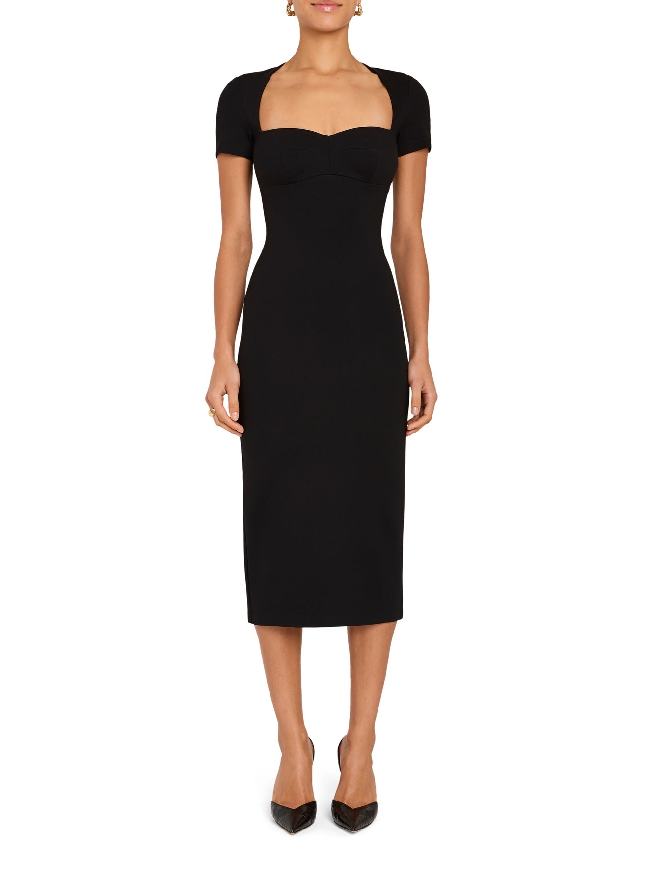 The Melodie Dress captures understated elegance with its sweetheart neckline and clean silhouette. Cut in a flattering midi length with short sleeves, this black dress transitions seamlessly from day to evening. Its modern, refined design works beautifully on its own or layered with a blazer for added polish. A timeless piece that embodies sophisticated simplicity.