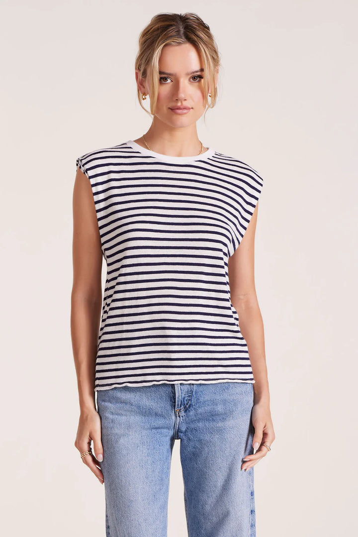 This lightweight crewneck style is the luxe layer for spring. With a wide drop shoulder this muscle-style sleeveless tee looks elevated in classic sailor stripe.