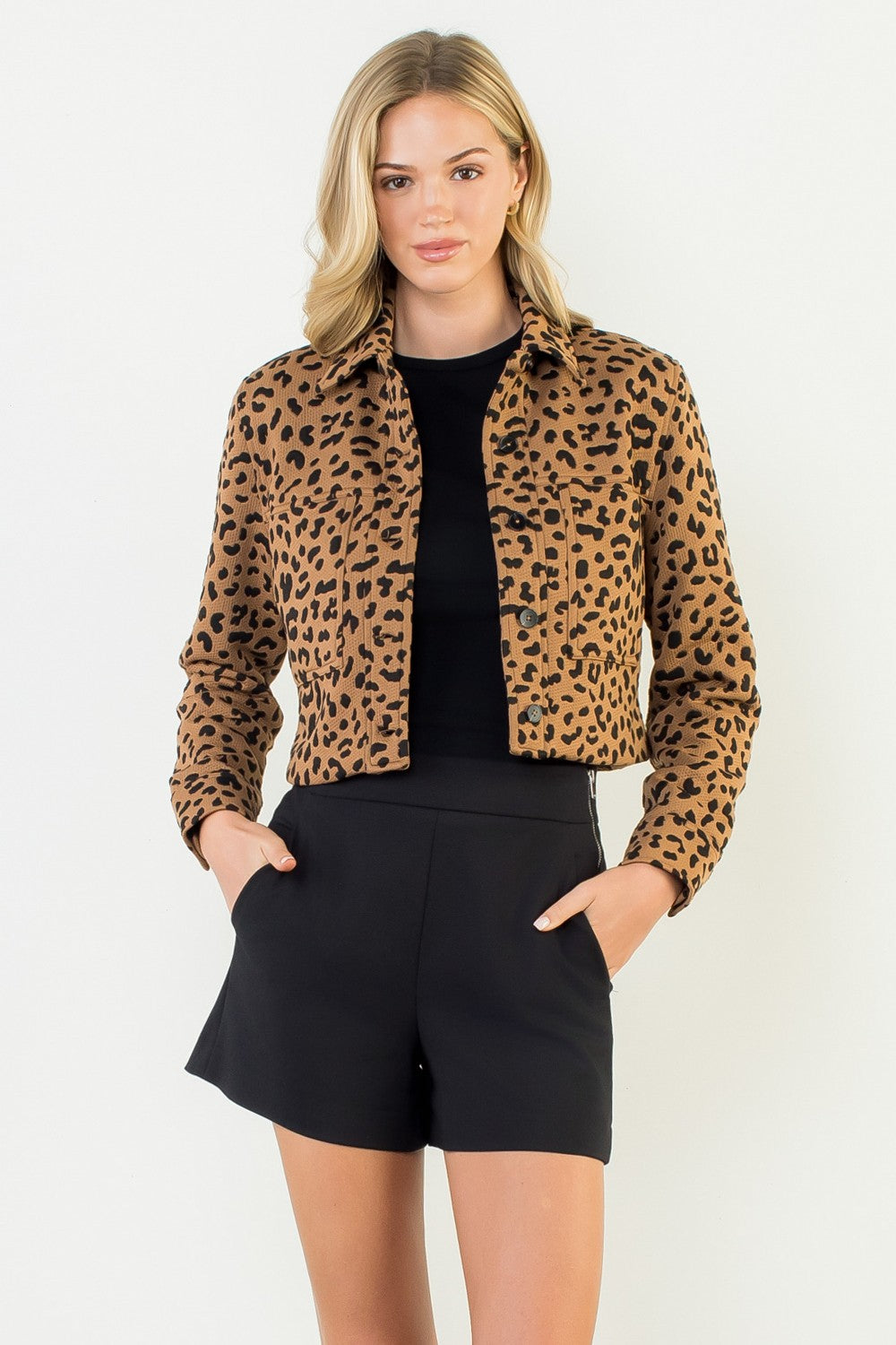 Elevate your wardrobe with this sophisticated cheetah print cropped jacket. Expertly woven from 97% polyester and 3% spandex, it offers a comfortable yet structured fit. Its bold pattern adds a refined edge to any outfit, making it perfect for stylish layering throughout the seasons.
