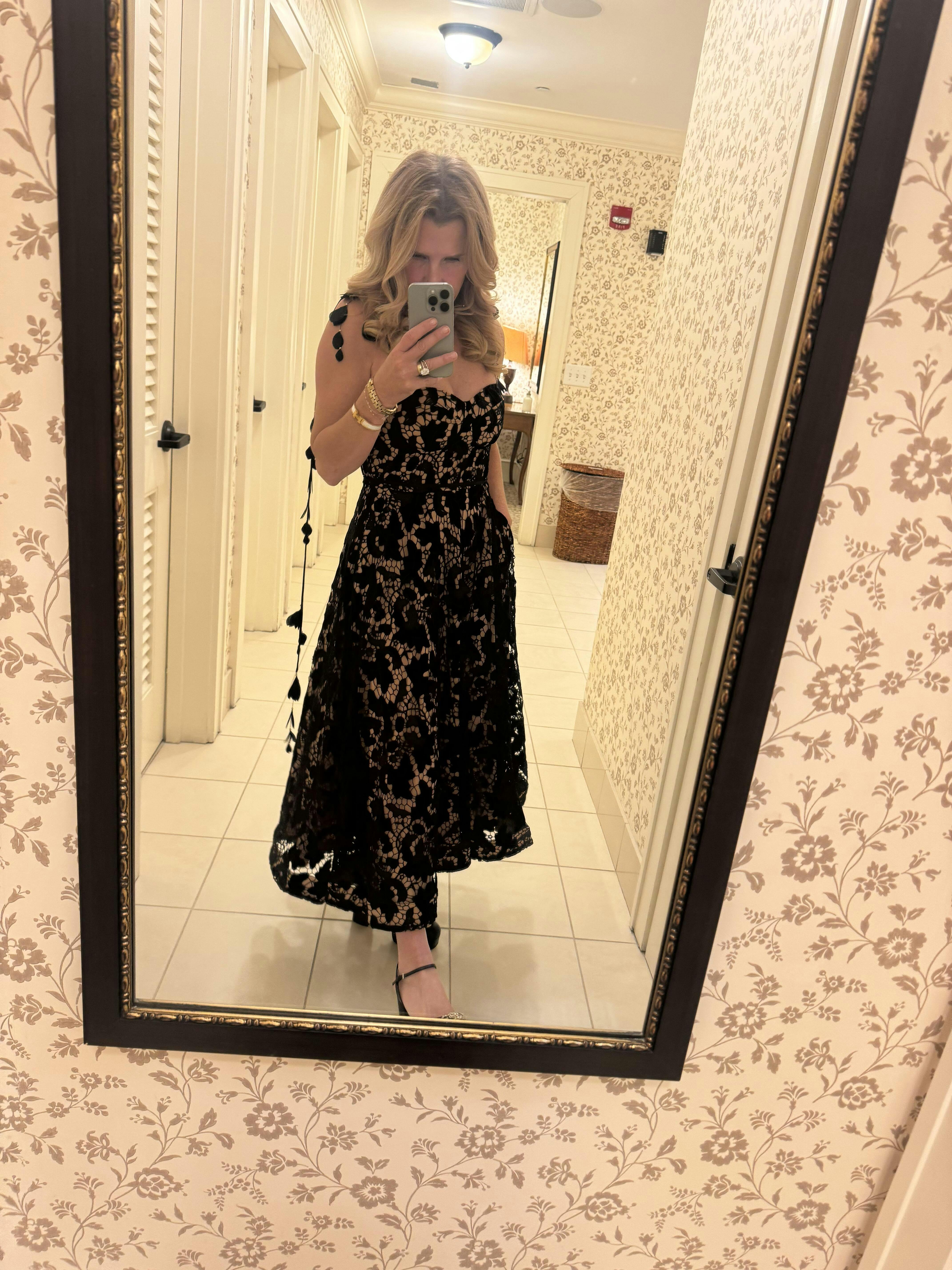 The Laurina Lace Bustier Midi Dress combines timeless elegance with contemporary details. Crafted from luxurious velvet lace, this midi features an embroidered cutwork design that adds refined texture and visual interest. The sweetheart neckline and sleeveless silhouette create a flattering, romantic look, while the structured A-line cut provides graceful movement. Functional side pockets and a center back zipper ensure both style and practicality. Delicate tie straps adorned with dimensional 3D flowers complete the sophisticated aesthetic. Approximately 47.75" in length, this polyester piece is hand wash recommended for lasting beauty.
