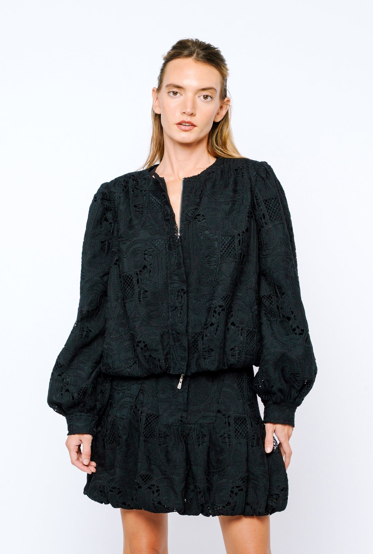 Elevate your layering game with this cropped bubble hem jacket, designed for modern sophistication. The zip-up silhouette offers effortless styling versatility, while the distinctive bubble hem adds contemporary flair to any ensemble. Cut to flatter, this piece works beautifully over dresses, tees, or fitted basics. Our model, standing 5'8", wears a size S for a refined, proportional fit. Perfect for transitional seasons or as a polished layer year-round.