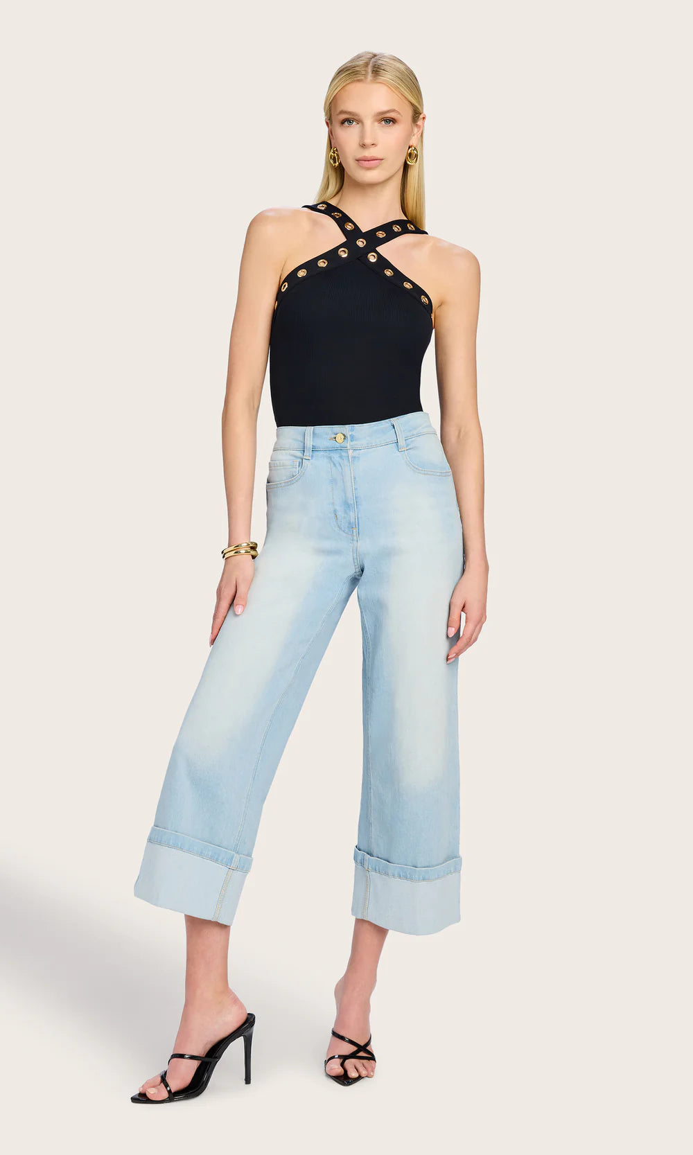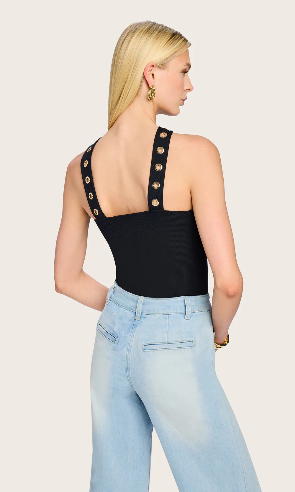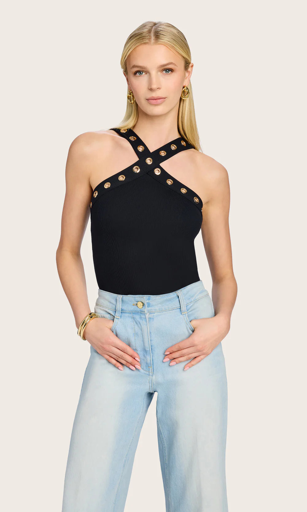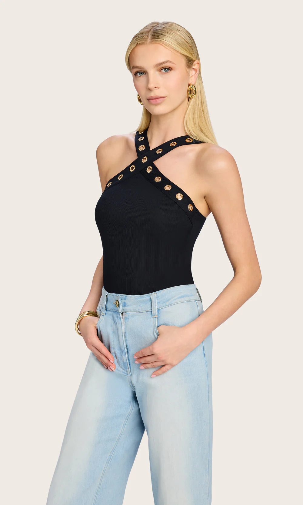 Gold-tone grommets along the crisscross halter neck give this fine rib bodysuit an edgy look. A striking piece that pairs effortlessly with jeans, pants, or skirts for a daring ensemble.