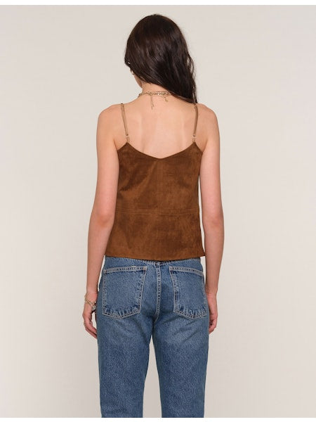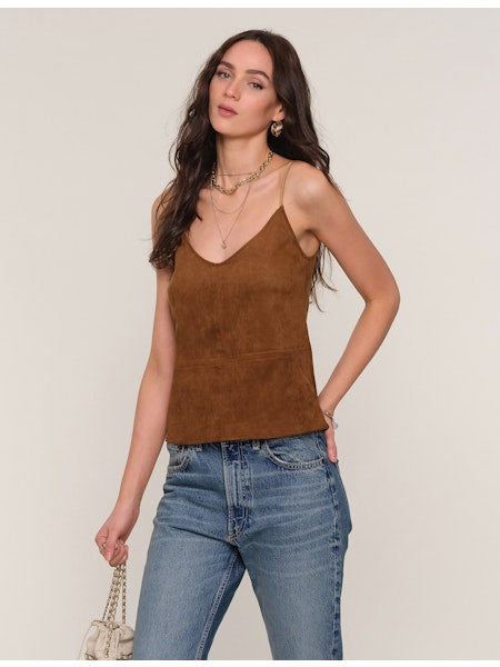 Elevate your wardrobe with the RAANI CAMI, a refined suede tank top featuring a flattering V-neckline. Its soft, luxurious texture offers both comfort and style, making it an ideal choice for sophisticated layering or a standalone statement piece. Perfect for transitioning from day to evening with effortless elegance.