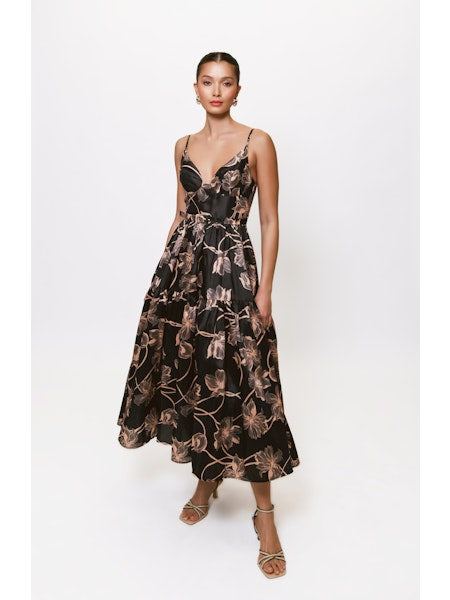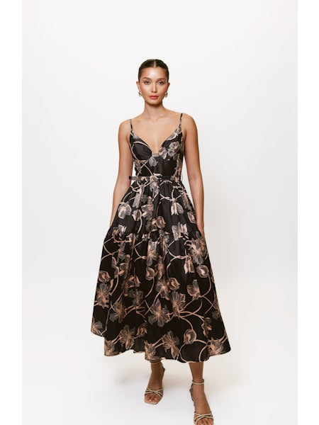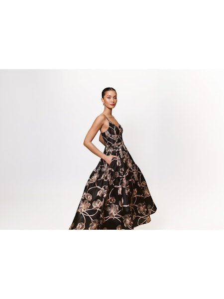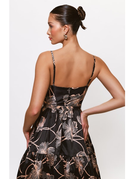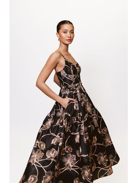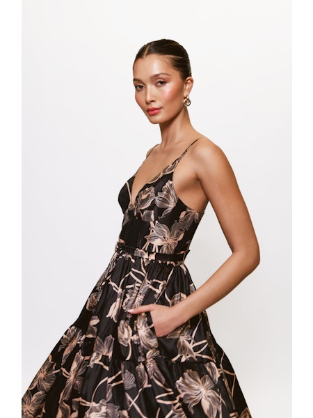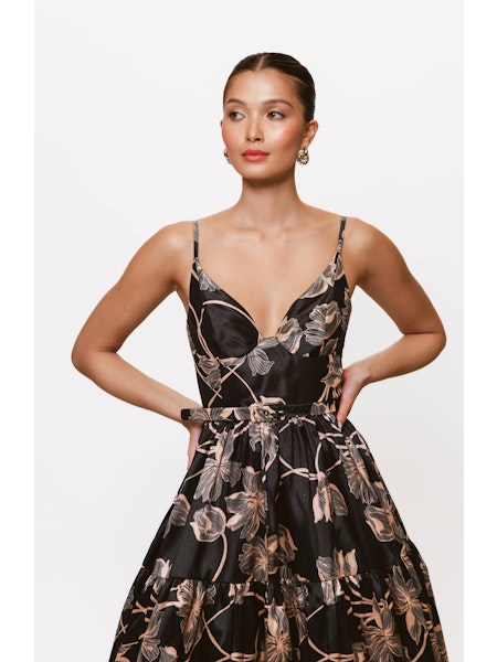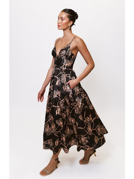 Elevate your wardrobe with the Atherton Dress, a sleeveless maxi featuring a refined belted waist and elegant printed fabric. Its flowing silhouette offers graceful movement, while the belt accentuates your figure for a polished, sophisticated look perfect for any occasion.