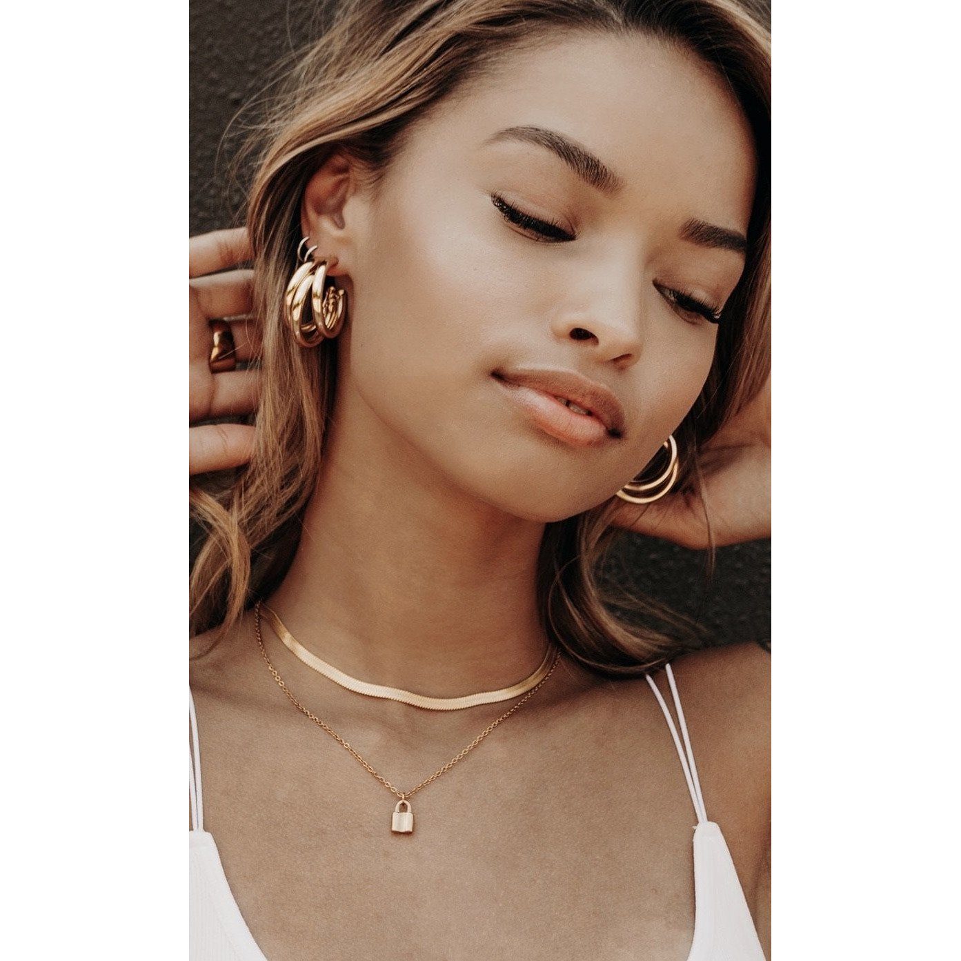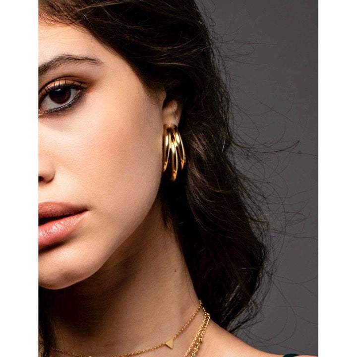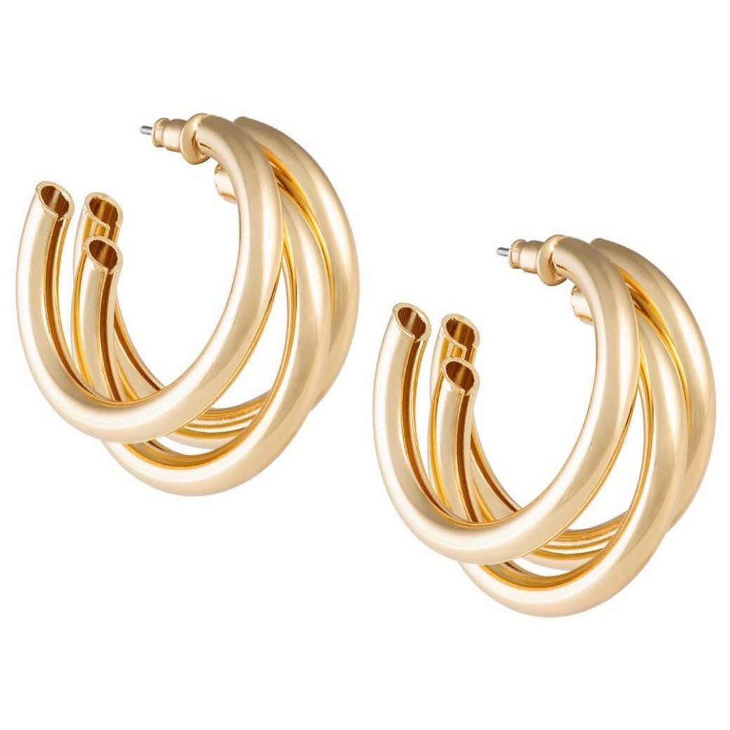 Lexi Tri-Hoop Earrings is the sleek statement pair you'll reach for everytime. Each side features a trio of sleek open cylindrical hoops, crafted from stainless steel and coated with 18K gold gilt. Subtle enough to wear in the day, yet stunning enough for a night out on the town.