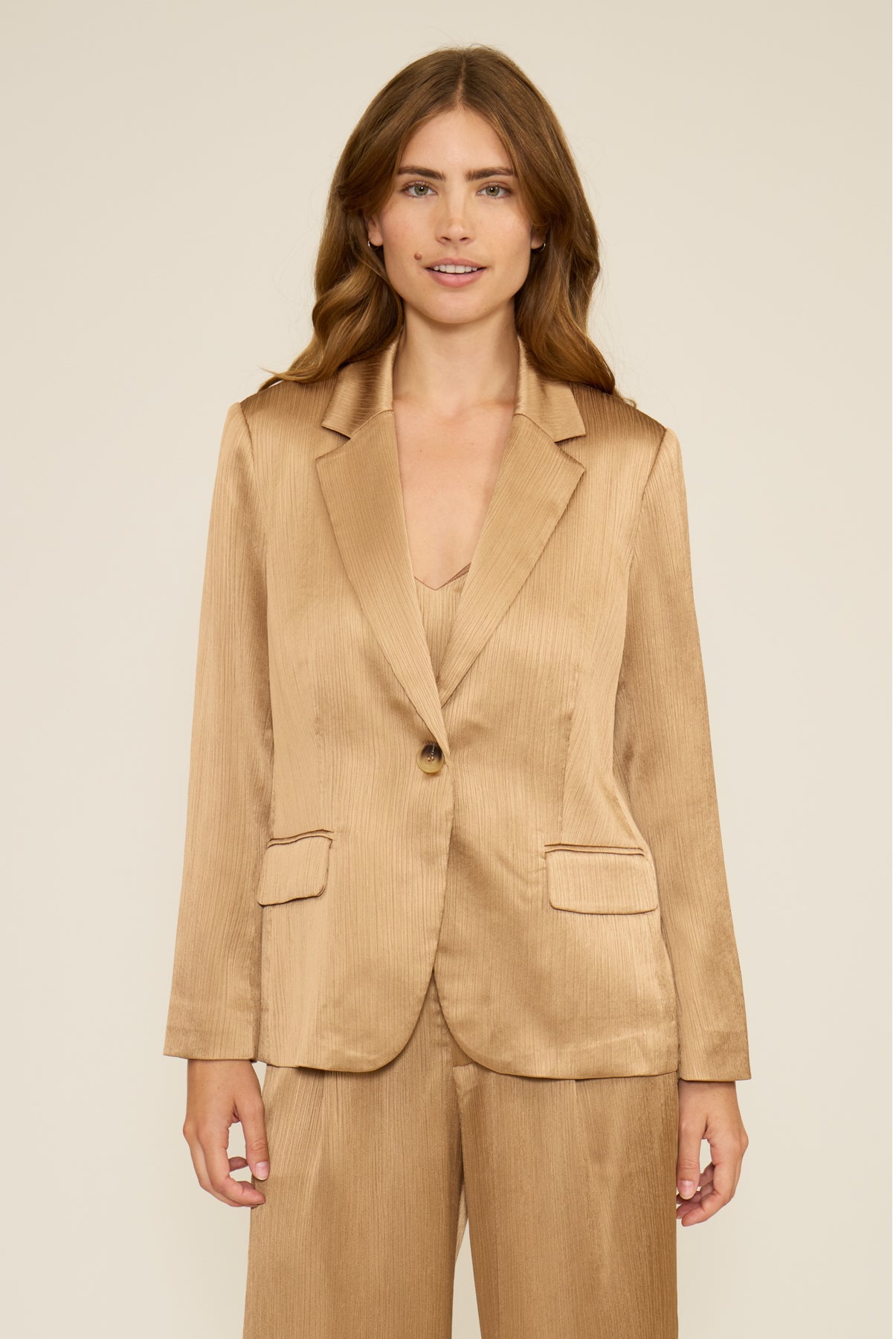 The Betty Blazer brings effortless polish to any wardrobe. Tailored with a crisp collar and button front, this silky piece strikes the perfect balance between structured elegance and comfortable wear. Layer it over dresses, tees, or tanks for an instantly refined look that transitions seamlessly from office to evening. Modern styling meets wearable luxury in this versatile essential.