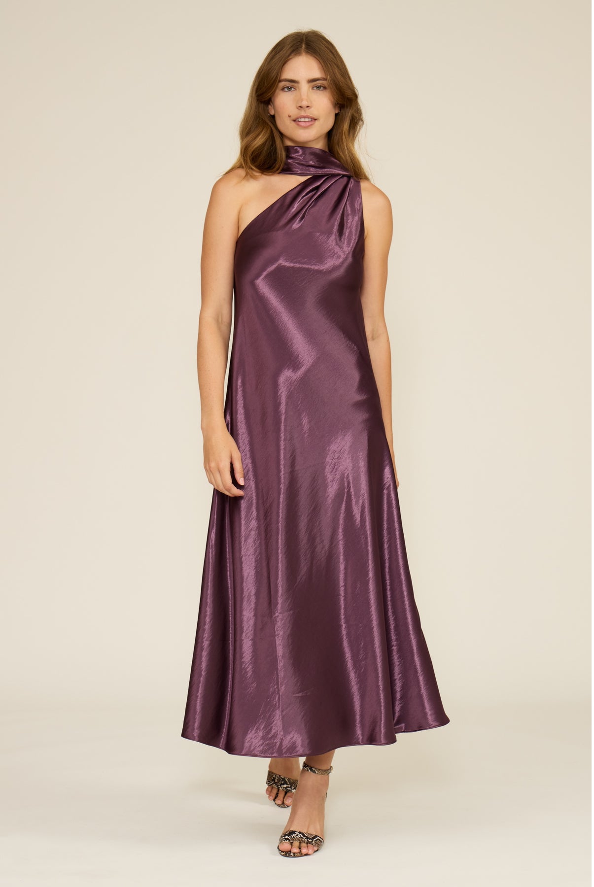 Effortless elegance meets dramatic flair in this one-shoulder maxi dress. Crafted from luxurious silky fabric, the flowing scarf detail adds movement and dimension while maintaining a refined silhouette. Perfect for formal occasions or elevated everyday moments, this dress transitions seamlessly from evening events to sophisticated gatherings. The asymmetrical neckline creates a flattering, contemporary look that feels both polished and undeniably chic.