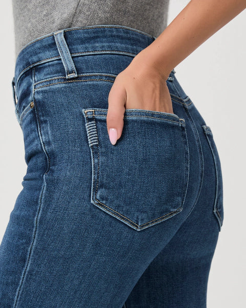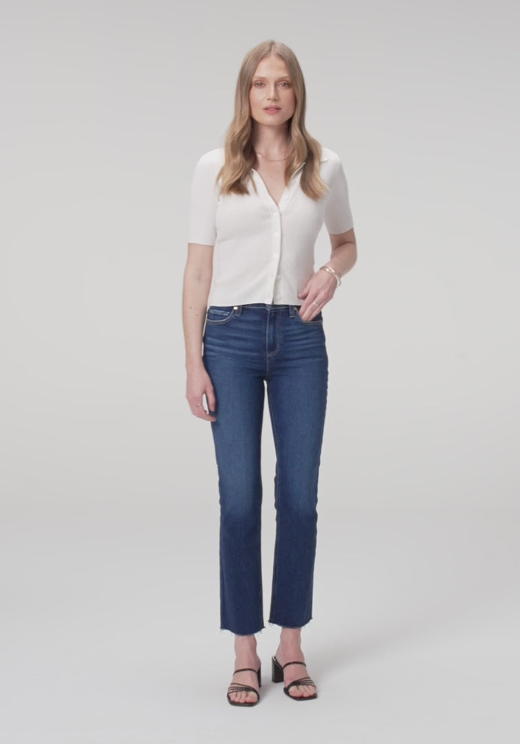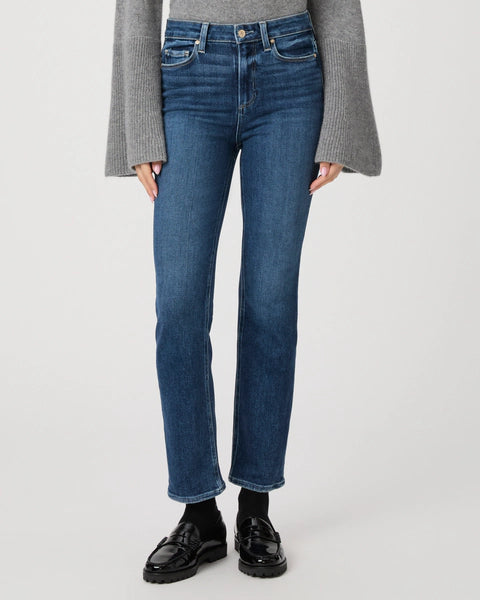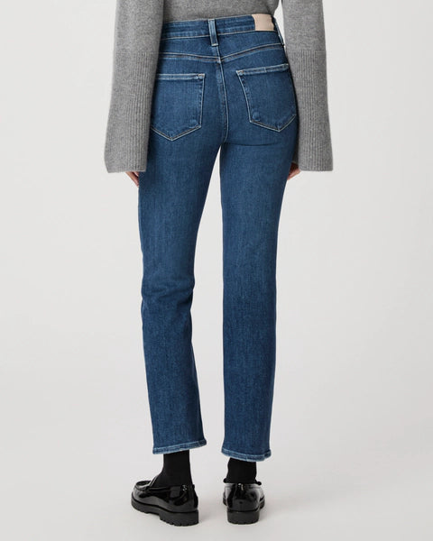 This high-rise, straight jean is lean through the leg and finishes at the ankle. This pair is crafted from our customer-favorite PAIGE VINTAGE denim in an aged dark wash with natural fading and german gold hardware. PAIGE VINTAGE takes all of the work out of breaking in your favorite pair of vintage jeans. We've combined the comfort of stretch with everything you love about authentic vintage denim to create super soft jeans that feel perfectly lived-in from the very first wear.
