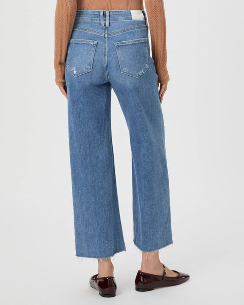 This high-rise wide leg has a slightly relaxed fit and an ankle length silhouette. This pair is crafted from our TRANSCEND VINTAGE denim in the perfect light wash with lived-in distressing, natural fading, set in front pockets, double belt loops and a raw hem. TRANSCEND VINTAGE denim has the look of authentic vintage denim but is incredibly comfortable with plenty of stretch and recovery.