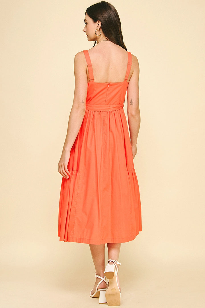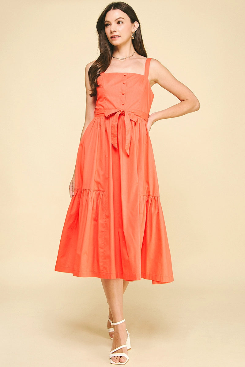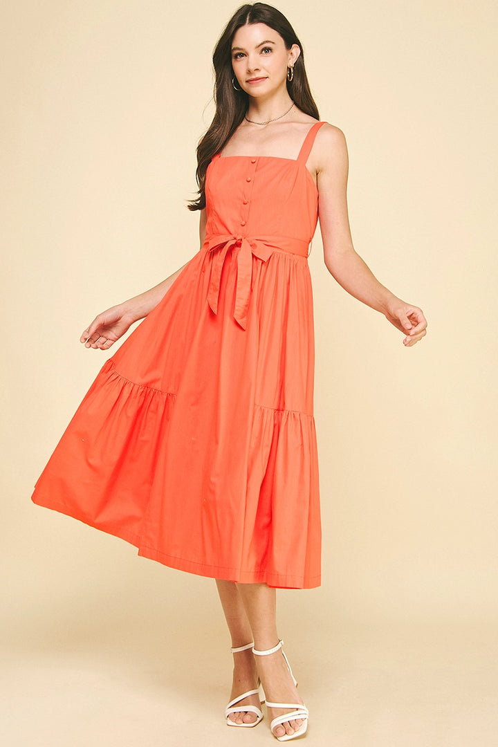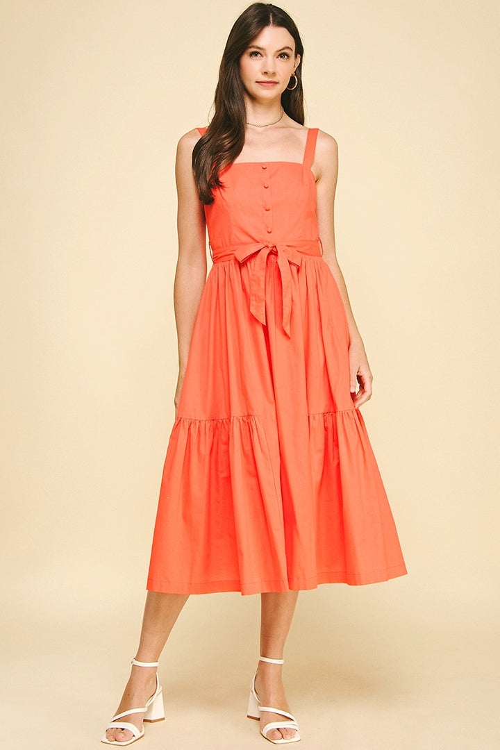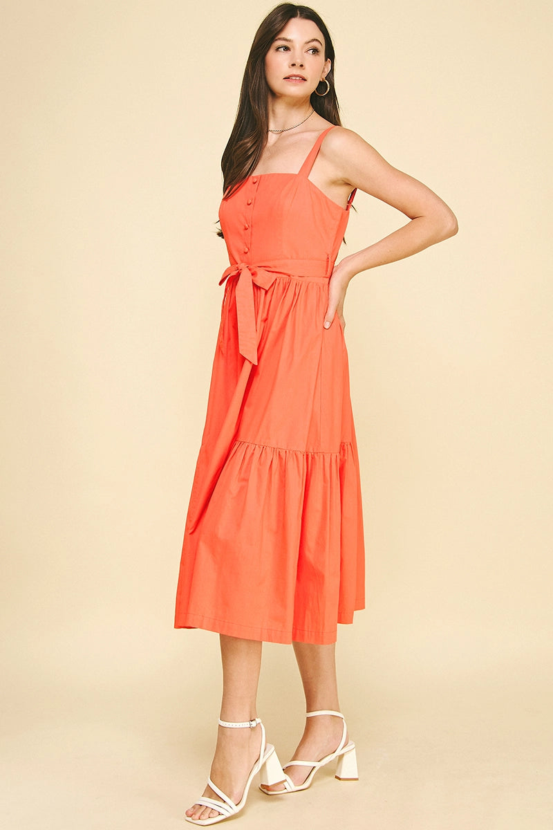 This sophisticated midi dress features elegant button details and a sleeveless design for a refined silhouette. The tiered skirt adds subtle movement and dimension, while the belt with loops cinches the waist for a flattering fit. Perfect for occasions that call for understated elegance.
