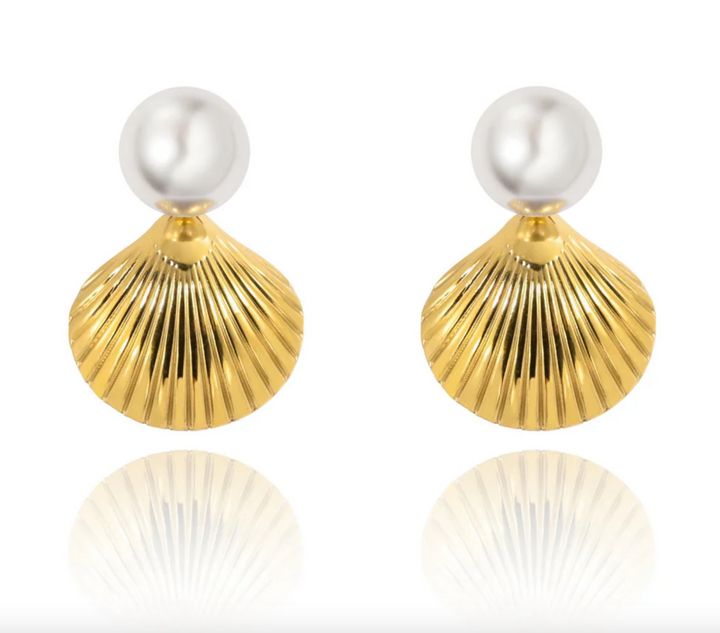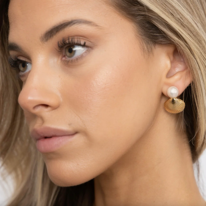 Complete your elegant look with our Sylvie Pearl Earrings. These stunning earrings feature a delicate pearl stud and a beautiful gold shell design, adding a touch of sophistication to any outfit. Perfect for any occasion, they make a great addition to your jewelry collection.