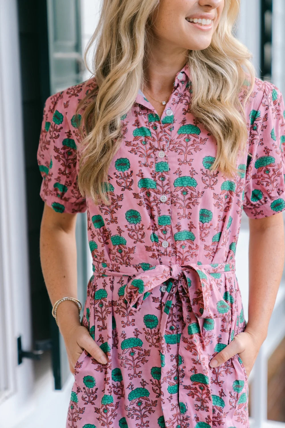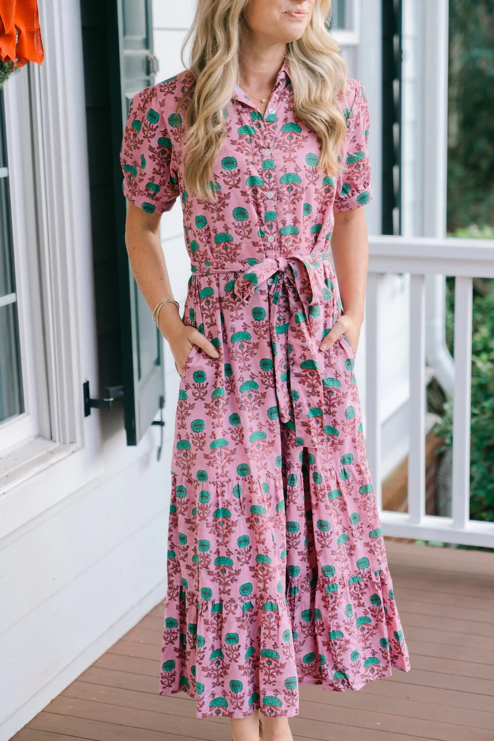The Val features a classic standard collar, button-front placket, short puff sleeves, a tiered skirt, side pockets, and a matching printed self tie belt.